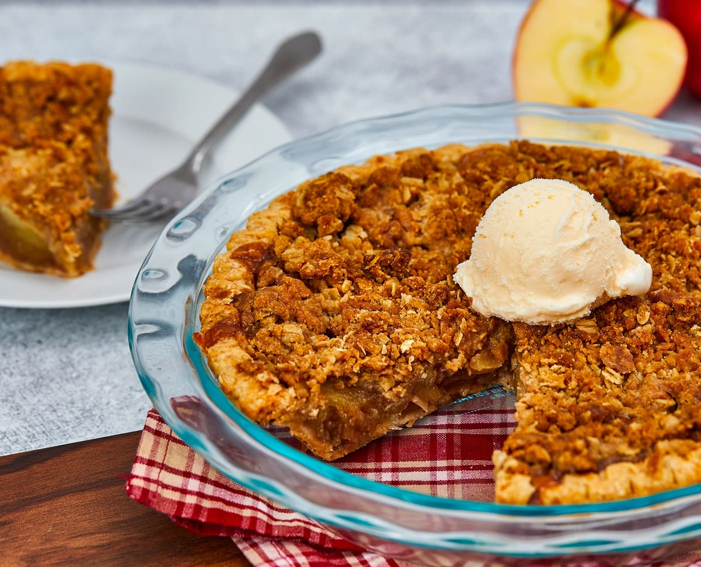 This pie is sinfully delicious and a cinch to make at home. Just fill the flaky pie crust with cinnamon and sugar–coated apples, then finish it with a crunchy oat crumb topping.